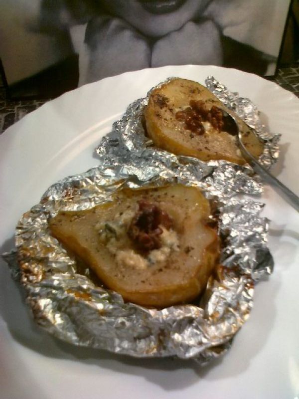 Gruszki obrać, przekroić na pół i wyciąć gniazda nasienne. Skropić sokiem z cytryny, posypać pieprzem. Ser pokroić na 8 porcji i włożyć w wydrążone miejsca w gruszkach. Na ser położyć połówkę obranego orzecha włoskiego. Tak przygotowane gruszki owinąć srebrną folią do pieczenia, [...]